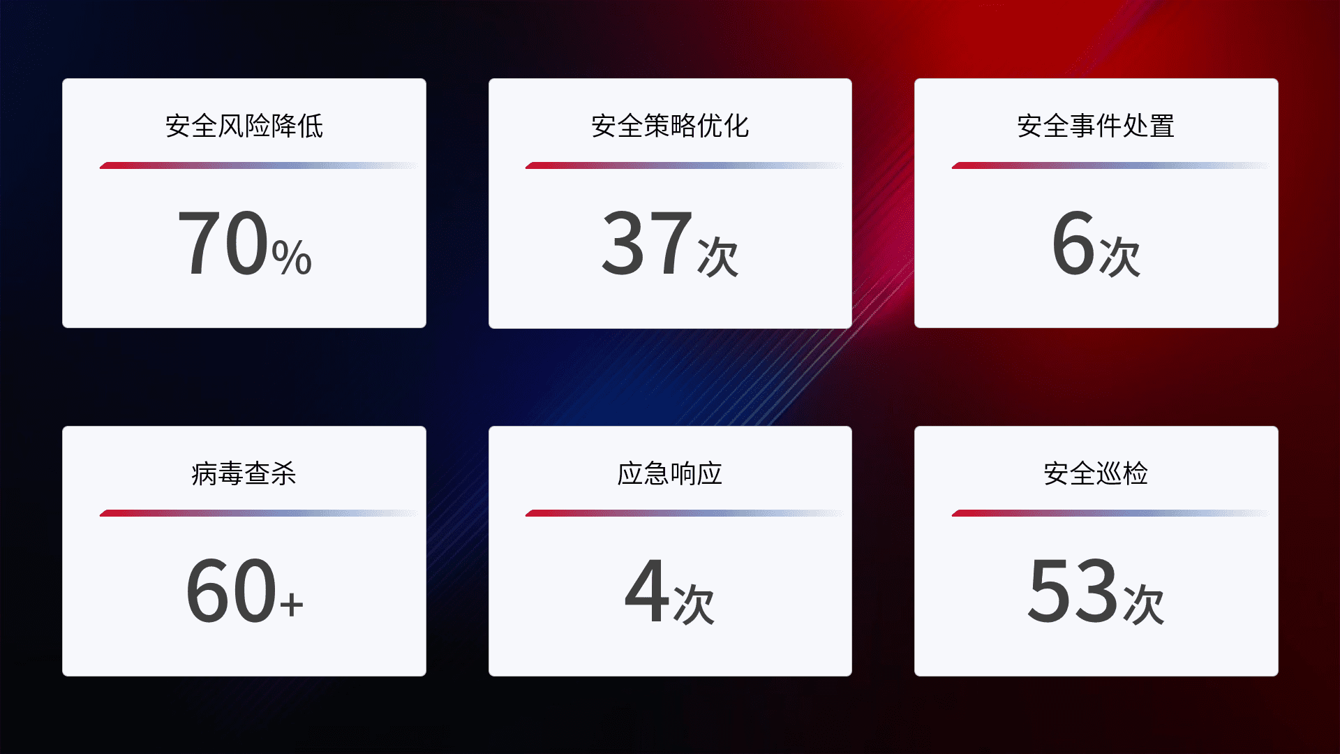 提供全面的安全事件报告体系,,,,包括处置报告、、周报、、、、季度和年度总结,,结合持续监控,,,帮助客户深入了解网络安全状况。。。
