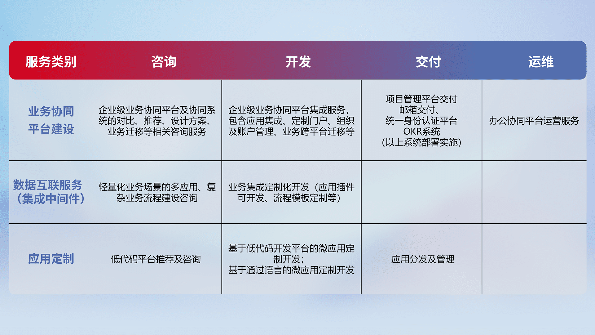 针对钉钉、、企微、、、IDaas等平台级产品提供产品的规划、、方案、、交付、、定制化开发等服务,,,,实现如统一协同办公、、智能客户服务、、、、混合会议管理、、智能数据查询、、、、等业务场景,,,,实现数字化转型。。。