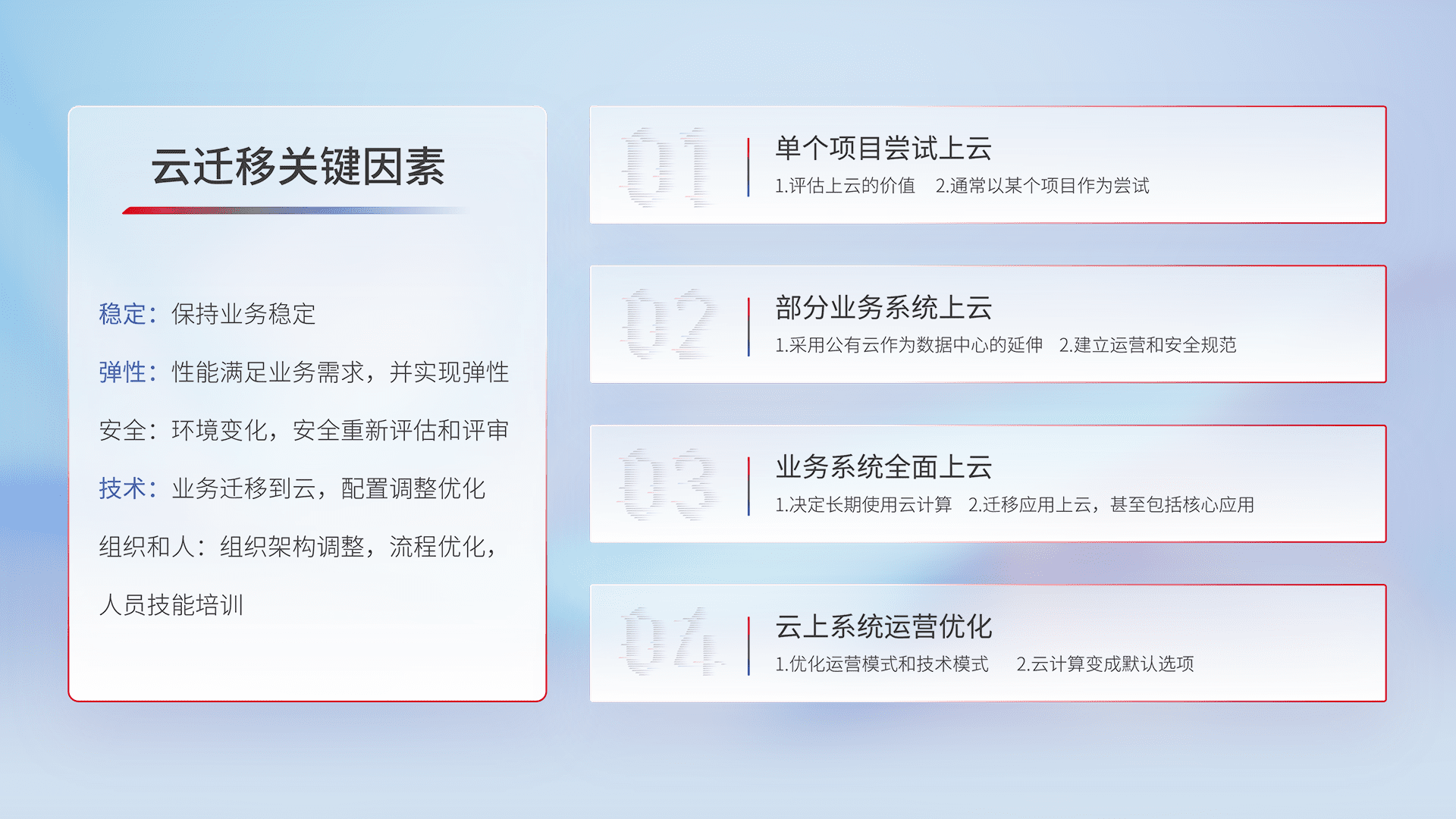结合实际业务,,,从规划设计、、、、云平台选型、、云原生改造、、数据迁移、、、、集成交付,,,迁移全过程为客户识别最佳上云路径,,,做好风险识别管理,,,设计网络架构、、、、身份权限、、、、安全审计合规、、、操作审计、、、、日志审计、、监控告警策略、、多站点容灾设计等,,,对云上基础设施进行整体规划,,,,提升IT治理水平,,,以满足弹性、、、高可用、、、、高性能的需求。。。。