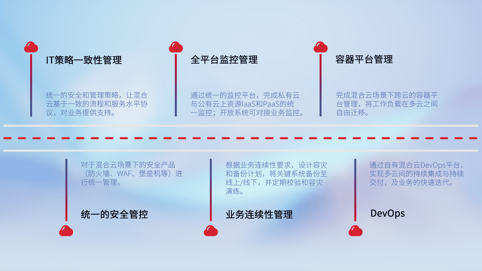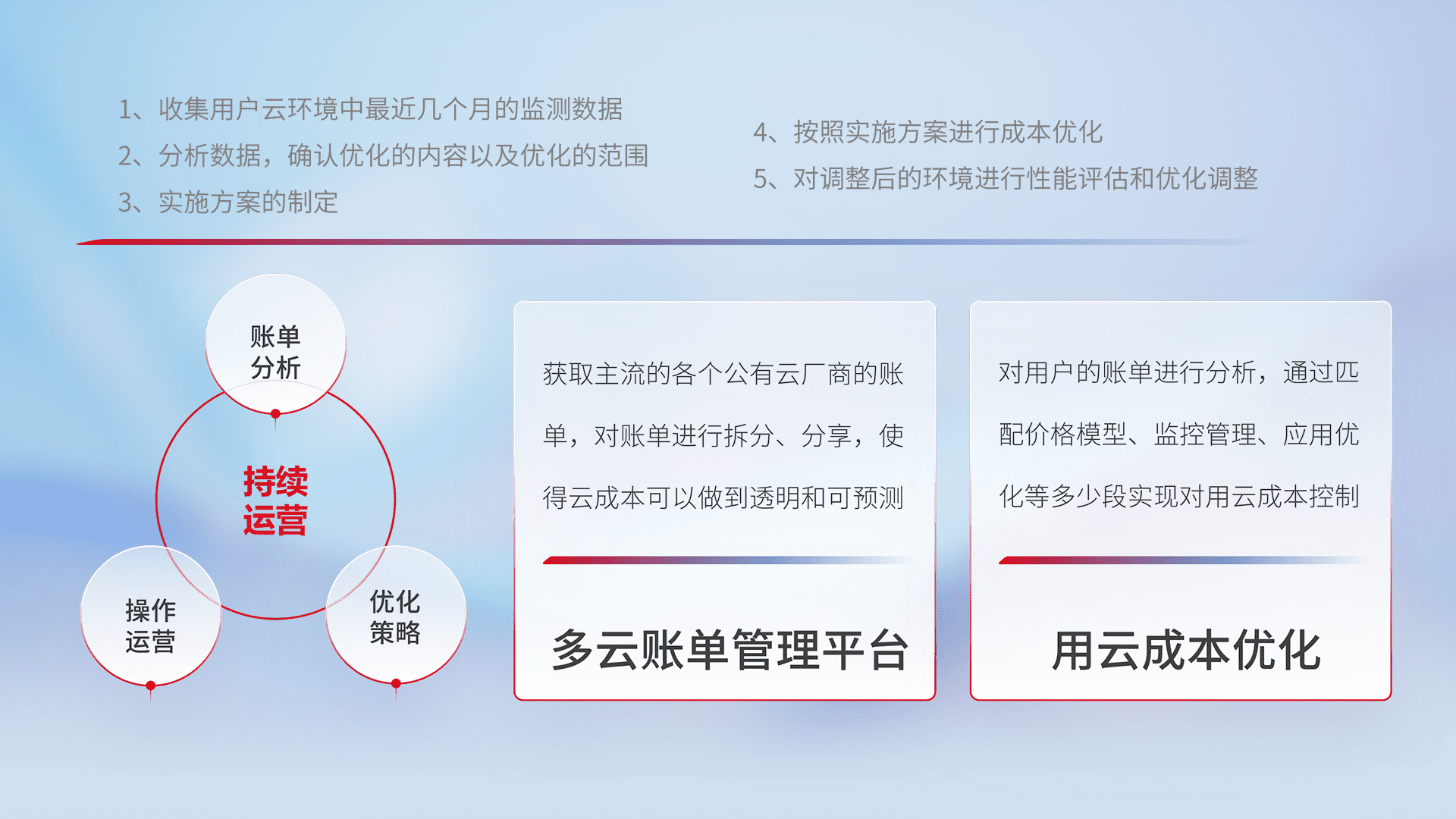 通过多云纳管,,,以统一的资源数据模型把客户的云资源进行抽象和封装,,,,进而实现对多云资源的统一操作,,保障云资源管理的可靠性、、稳定性与可用性。。。量身定制化运维内容,,,配置、、开发运维、、补丁管理、、、备份、、、监控、、、、认证和访问管理、、、审计和日常巡检等,,,,保障在用云过程中的可靠度,,,稳定度以及高可用率。。
